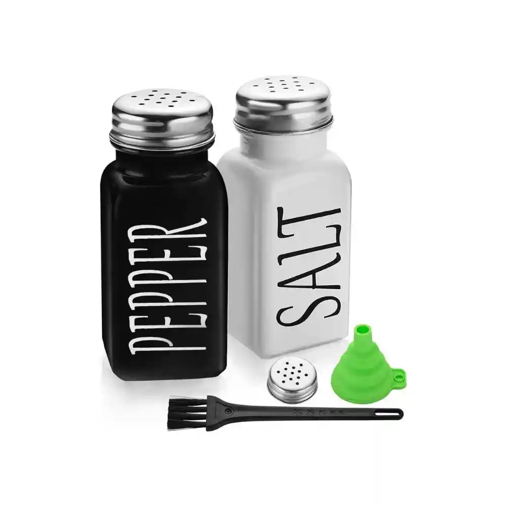 Bonito diseño de granja: este juego de salero y pimentero blanco y negro de vidrio vintage está hecho de vidrio de alta calidad con una tapa de acero inoxidable para un aspecto encantador y sofisticado. Mide 1.57 x 1.57 x 3.54 pulgadas, son fáciles de sostener y usar. Inspirados en el estilo moderno y el aspecto antiguo de la decoración campestre, estos saleros y pimenteros añadirán un toque vintage a la decoración de tu hogar. Se adaptan perfectamente a la cocina en blanco y negro. Fácil de llenar: simplemente desenrosca las tapas de acero inoxidable de los saleros y pimenteros para un llenado rápido y fácil, o utiliza el embudo plegable para rellenar sin preocuparte por derramar artículos de condimento afuera durante el proceso de llenado. Nuestros dispensadores de sal y pimienta están diseñados para un uso a largo plazo. No es un salero y pimentero desechable.