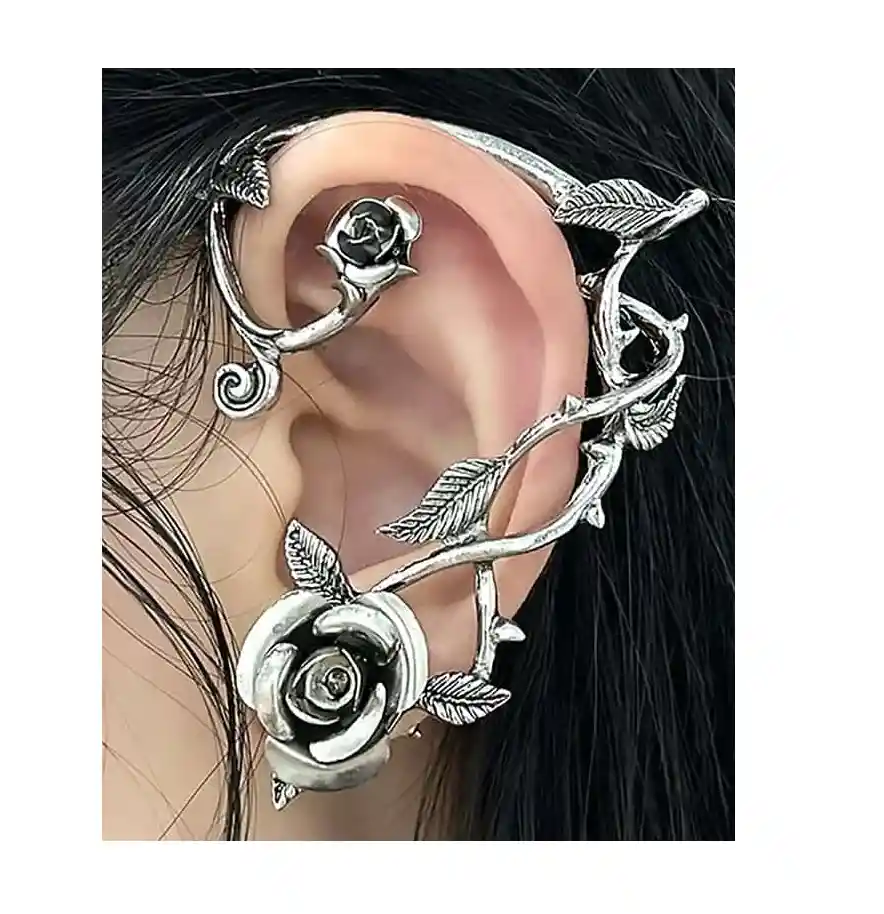Ear Cuff Aretes Clip Aretes Para Una Sola Oreja Diseño Rosa Los accesorios son una parte fundamental en nuestro diario vestir, resaltan nuestra belleza natural y nos hacen lucir mas estilizadas. Ear Cuff Aretes para una sola oreja que solo necesita 1 perforación, la tradicional, el arete abraza el resto de la oreja, su diseño de rosa con enredadera de hojas en tono plateado con negro lo hacen ver único. Es un diseño original de VANIDADES COLLECTIONS