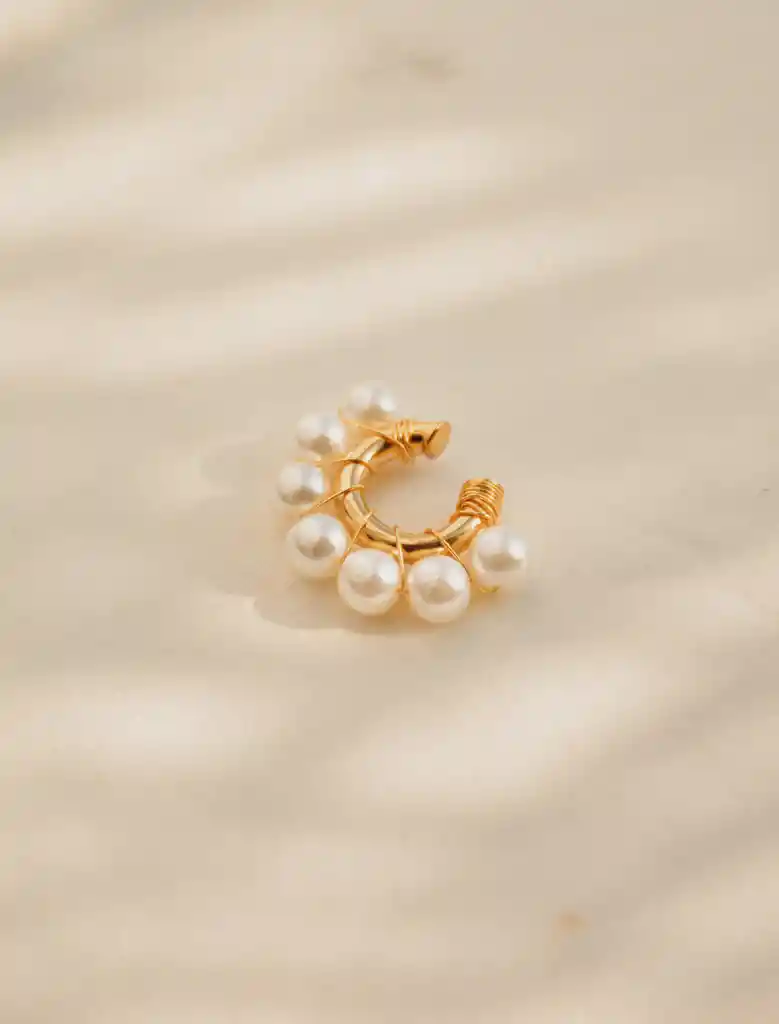 Earcuff dorado tejido con maxi perlas, divino e ideal para ocasiones especiales. (Precio por unidad) Nota: El precio incluye el earcuff, la imagen de las candongas es un referente de como las puedes combinar. Cuidado: Recomendamos separar las piezas, almacenarlas en lugares secos y a temperatura ambiente; no aplicar lociones, cremas y tampoco mojarlos, ya que la durabilidad de los accesorios depende 100% del cuidado de cada persona