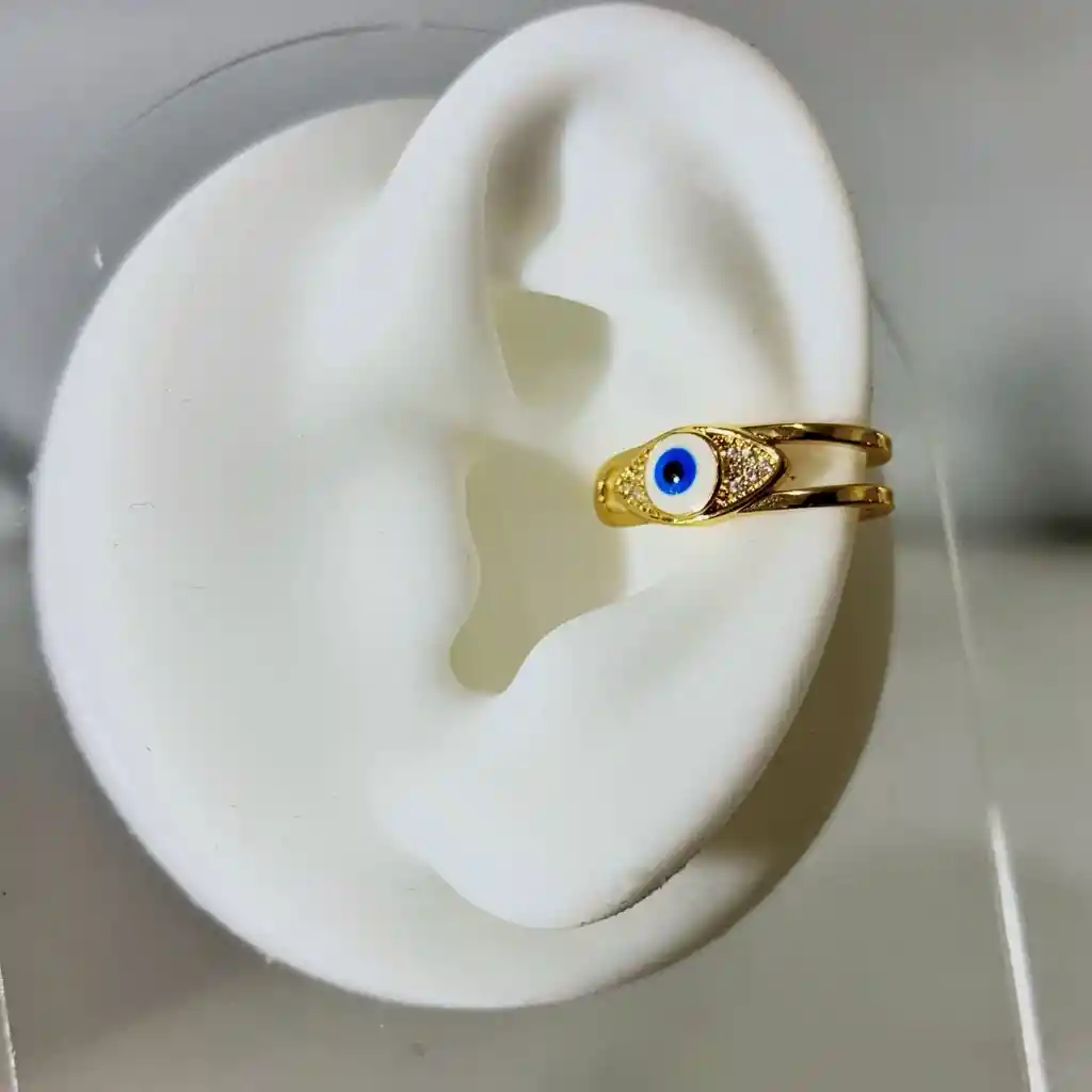 Ear cuff con figura de ojo turco y piedras, sin necesidad de perforación. Baño de Oro de 24K.