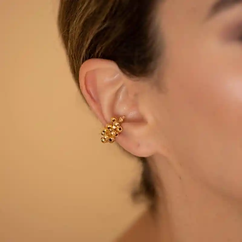 Earcuff dorado tejido con balines, elegantes y divinos para ocasiones especiales. (Precio por unidad) MATERIAL: Goldfield Color: Dorado Cuidado: Recomendamos separar las piezas, almacenarlas en lugares secos y a temperatura ambiente; no aplicar lociones, cremas y tampoco mojarlos, ya que la durabilidad de los accesorios depende 100% del cuidado de cada persona