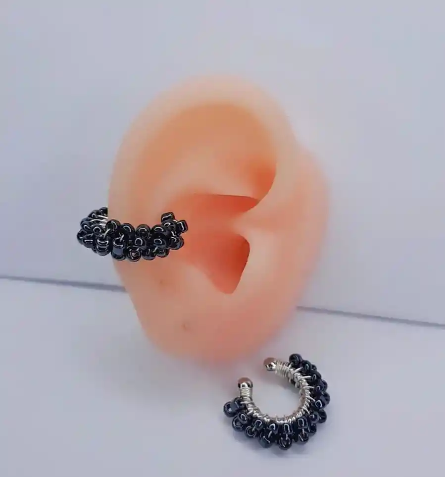 HERMOSO EARCUFF TEJIDO CON PIEDRAS NEGRAS, ELABORADA EN MOSTACILLA, PERFECTA PARA COMBINAR TU OUTFIT, TE VERAS HERMOSA, ÚNICA Y A LA MODA