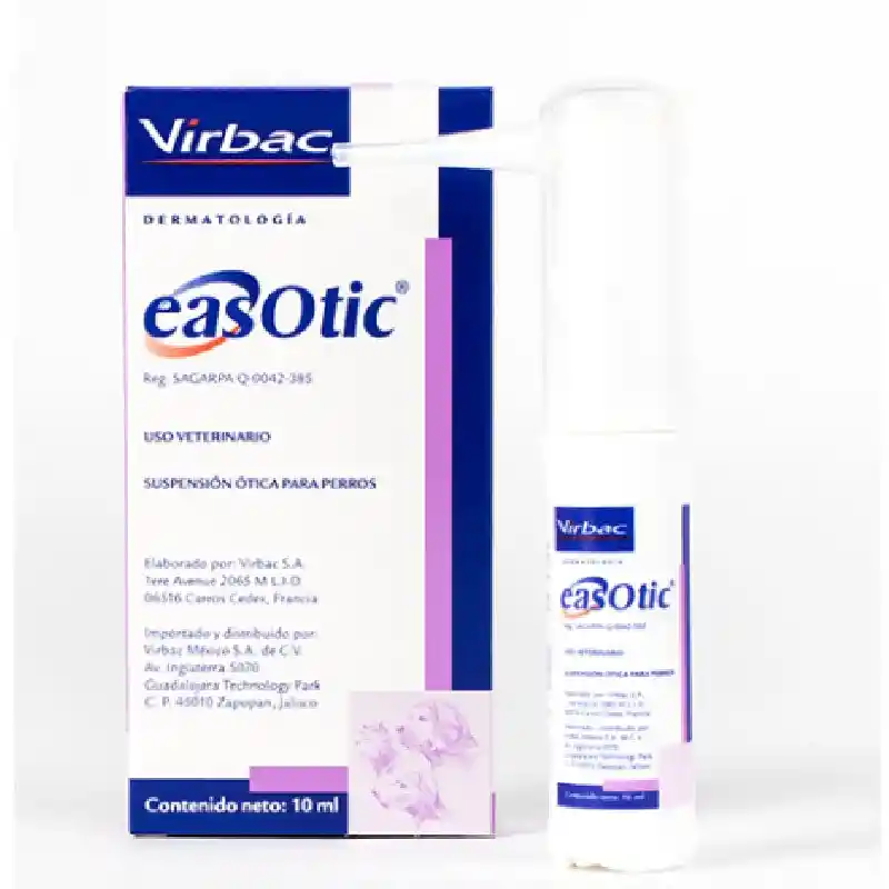 Easotic es un medicamento veterinario de la marca Virbac diseñado para tratar la otitis externa aguda en perros, combinando tres ingredientes activos: hidrocortisona aceponato (antiinflamatorio), gentamicina (antibiótico) y miconazol (antifúngico), para combatir inflamación, bacterias y hongos en solo 5 días, con una aplicación sencilla y una boquilla flexible para mayor comodidad del animal.