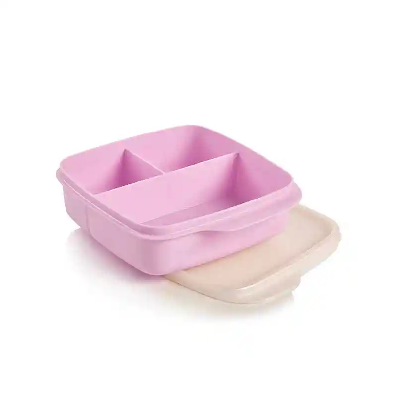 Lleva snacks saludables a donde vayas. El práctico Eco Lunch cuenta con tres divisiones, una grande y dos más pequeñas, en las que pueden trasportar comidas balanceadas para llevar al trabajo o al colegio puedes llevar frutas, frutos secos, galletas y mucho más. El recipiente tiene una pestaña para que puedas abrirlo fácilmente. Recomendación: transportar el recipienta horizontalmente, que los alimentos no drenen mucha humedad. Dimensiones 16.5 x 15.5 x 4.7 cm de alto; 550ml de capacidad .