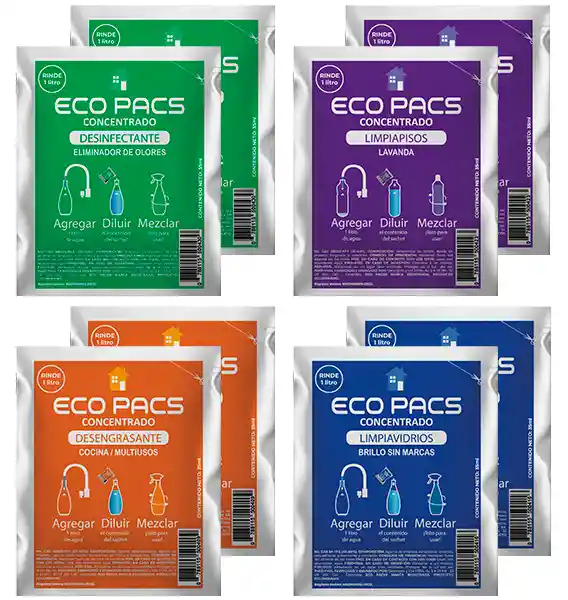 2 Desengrasantes de Cocina (rinde 2 Litros), 2 Limpiavidrios (rinde 2 Litros), 2 Desinfectantes Multiusos Eliminador de Olores (rinde 2 Litros) y 2 Limpiapisos (rinde 2 Litros)