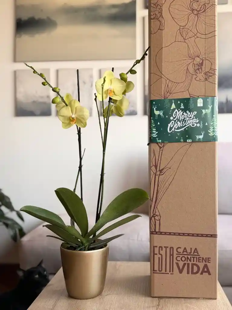 Hermosa orquídea natural ( Altura promedio 70 cm ) INCLUYE CAJA Incluye: Portamaceta CERÁMICA Tarjeta personalizada ( Por favor escribir en el chat) Tarjeta de cuidados NOTA: Todas las plantas son únicas, por lo que pueden presentar diferente número de botones, flores y cambio de altura a la fotografía de referencia.