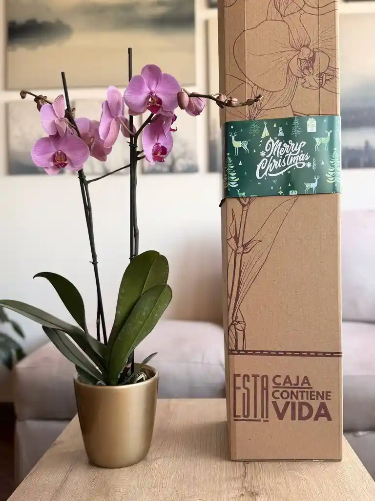 Hermosa orquídea natural ( Altura promedio 70 cm ) INCLUYE CAJA Incluye: Portamaceta CERÁMICA Tarjeta personalizada ( Por favor escribir en el chat) Tarjeta de cuidados NOTA: Todas las plantas son únicas, por lo que pueden presentar diferente número de botones, flores y cambio de altura a la fotografía de referencia.