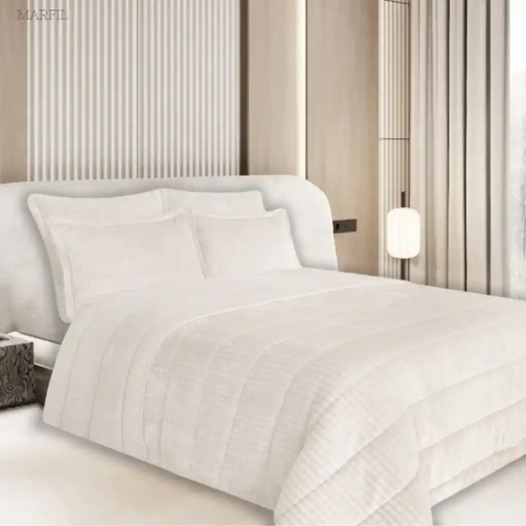 Edredón Cantabria Doble, piel de durazno, unicolor marfil, 3 Piezas Medidas: Para cama doble 140 x 190 cm Edredón: 220x240 cm Dos fundas: 50x70 cm - Se caracteriza por su increíble suavidad y capacidad para proporcionar calor, lo que lo convierte en una de las opciones preferidas para climas fríos. - Confeccionado con flannel burbuja y flannel liso (piel de durazno). - 100% poliéster doble faz. - Diseñado para ofrecer una experiencia suave y acogedora. -Hecho en Colombia Cubrelecho, Cubrecama, Edredon, Plumon