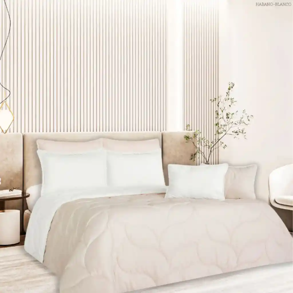 Edredón doble, unicolor doble faz, Blanco-Habano, 5 Piezas Medidas: Para cama doble 140 x 190 cm Edredón: 220x240 cm Dos fundas: 50x70 cm Dos cojines: 28x45 cm Edredón de alta calidad, clásico y elegante que destaca por su simplicidad y versatilidad. Microfibra unicolor 100% poliéster Termosellado Relleno de fibra siliconada Costura especial que asegura el relleno a largo plazo Apariencia ordenada y serena Ideal para quienes prefieren un ambiente relajante y armonioso en su dormitorio Hecho en Colombia Cubrelecho, Cubrecama, Edredon, Plumon