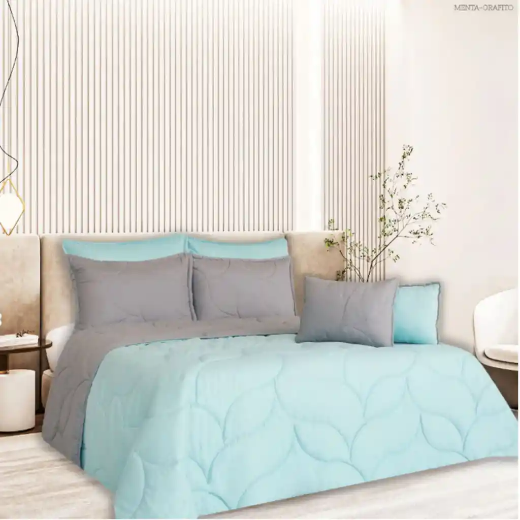 Edredón doble, unicolor doble faz, Turquesa-Plata, 5 Piezas Medidas: Para cama doble 140 x 190 cm Edredón: 220x240 cm Dos fundas: 50x70 cm Dos cojines: 28x45 cm Edredón de alta calidad, clásico y elegante que destaca por su simplicidad y versatilidad. Microfibra unicolor 100% poliéster Termosellado Relleno de fibra siliconada Costura especial que asegura el relleno a largo plazo Apariencia ordenada y serena Ideal para quienes prefieren un ambiente relajante y armonioso en su dormitorio Hecho en Colombia Cubrelecho, Cubrecama, Edredon, Plumon