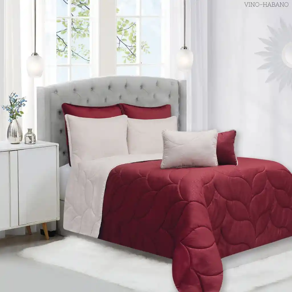 Edredón doble, unicolor doble faz, Vinotinto-Habano, 5 Piezas Medidas: Para cama doble 140 x 190 cm Edredón: 220x240 cm Dos fundas: 50x70 cm Dos cojines: 28x45 cm Edredón de alta calidad, clásico y elegante que destaca por su simplicidad y versatilidad. Microfibra unicolor 100% poliéster Termosellado Relleno de fibra siliconada Costura especial que asegura el relleno a largo plazo Apariencia ordenada y serena Ideal para quienes prefieren un ambiente relajante y armonioso en su dormitorio Hecho en Colombia Cubrelecho, Cubrecama, Edredon, Plumon