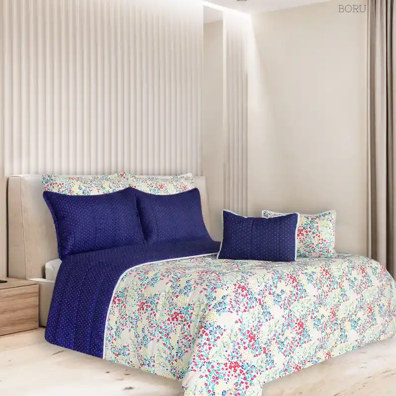 dredón Primavera Queen Boru Doble Faz Estampada para Cama Queen (160 X 190 cm). Edredón Doble Faz, prensado con hilo-aguja Lado 1 Fondo Azul Oscuro Putitos Amarillos Lado 2 Fondo Blanco Floresitas Pequeñas Rojo Amarillo Turquesa Incluye: 5 piezas: Un edredón de (240 X 240 cm) Dos fundas de almohada (50 X 70 cm) Dos cojines de (28x45 cm) Material: Exterior: Microfibra 100% Poliéster Relleno: Acolchado Guata. Cuidados: No usar detergente con blanqueador No dejar en remojo, ni cepille Lavar con prendas de igual tono En máquina, lavar en ciclo suave