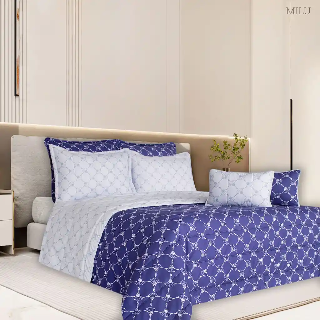 Edredón Primavera Doble Faz Estampada Milu para Cama Sencilla (100 X 190 cm). Edredón Doble Faz, prensado con hilo-aguja. Lado 1 Fondo Azul Oscuro Lado 2 Fondo Azul Claro Incluye: 3 piezas: Un edredón de ( 170 X 240 cm) Una funda de almohada ( 50 X 70 cm) Un Cojín de (28x45 cm ) Material: Exterior: Microfibra 100% Poliéster Relleno: Acolchado Guata. Cuidados: No usar detergente con blanqueador No dejar en remojo, ni cepille Lavar con prendas de igual tono En máquina, lavar en ciclo suave Secar a la sombra o máquina en el ciclo de planchado