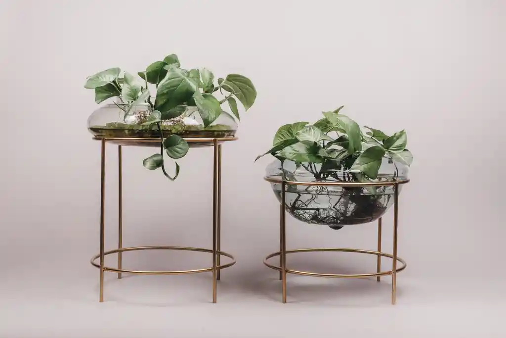 Matera tipo acuario con estructura en metal gold / Diametro interno: 24 cms, Diametro externo: 40 cms, Alto: 14 cms