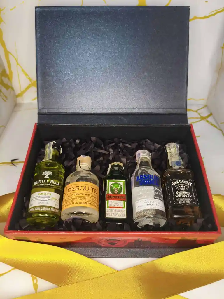 Eleva tus regalos al siguiente nivel con este set de mini licores en un estuche premium que combina elegancia y portabilidad. Ideal para cualquier ocasión: el detalle que todos recordarán. Y para que tu regalo sea 100% tuyo, tienes la opción de solicitar una tarjeta personalizada con foto y mensaje. Simplemente coordínalo por mensaje interno al confirmar tu compra. Contiene: Licor Jägermeister 20 ml Vodka Absolut 50 ml Whisky Jack Daniels 50 ml Gin Whitley Neill 50 ml Aguardiente Desquite 50 ml