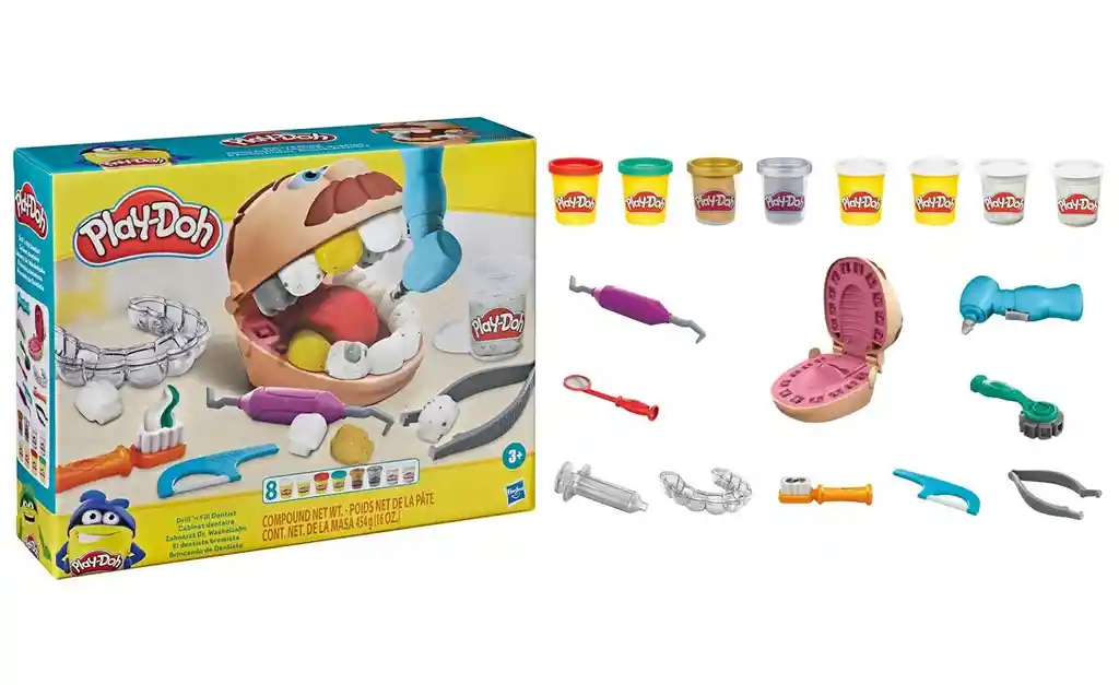 ¡El dentista bromista se encargará del paciente antes que le duelan los dientes! Aun si da un poquito de miedo ir al dentista, los niños pueden tomar el control de la experiencia al jugar al dentista con este juego Play-Doh. Los niños y niñas pueden hacer que el paciente saque la lengua de Play-Doh y luego usar el molde de dientes para crear toda una fila de dientes Play-Doh. Luego pueden comenzar a taladrar y rellenar con el taladro de juguete sin pilas y el extrusor. La masa para moldear color de caries tiene puntos verdes para simular el deterioro dental, y la masas plateada y dorada son perfectas para crear frenos y rellenos dentales. Con un total de 10 herramientas dentales de juguete y 8 latas Play-Doh no tóxicas, ¡este set de dentista es una fantástica actividad o regalo para los niños de 3 años en adelante!