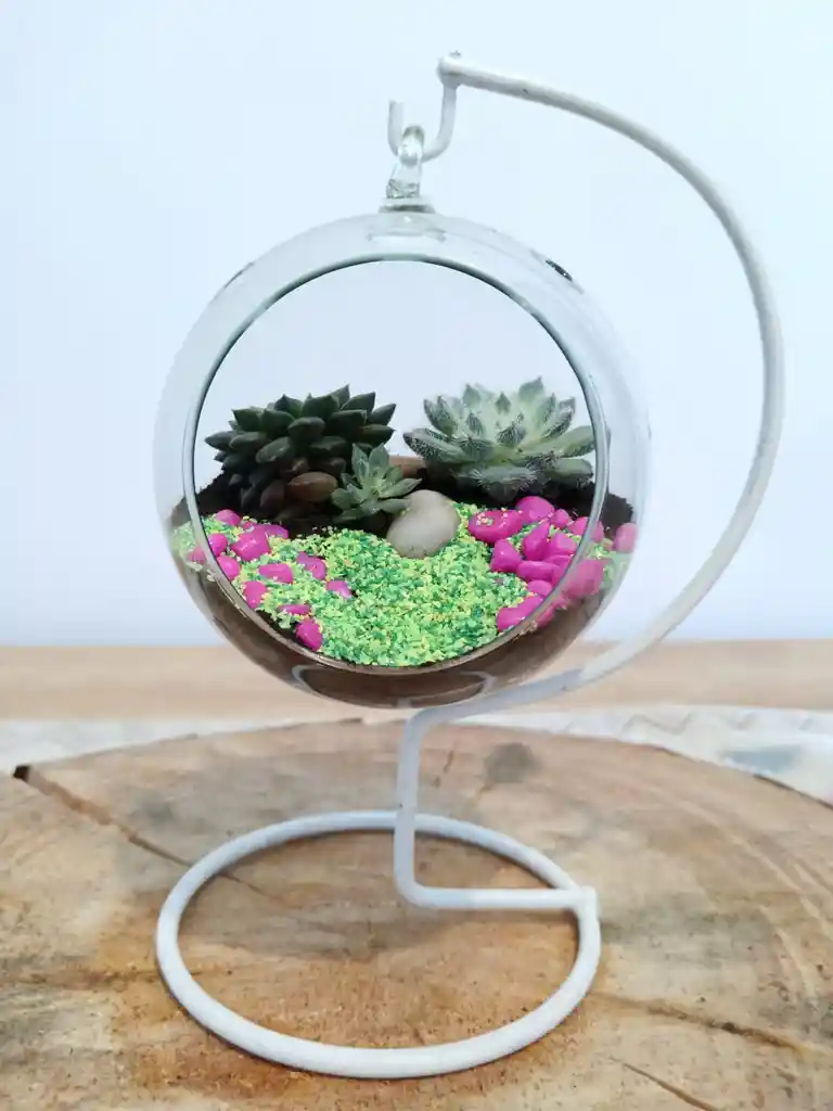 "Un estallido de energía encerrado en cristal. Este terrario no es solo una planta es una explosión controlada de color, donde la frescura de las suculentas cobra vida gracias al vibrante contraste con el rosa eléctrico de sus piedras. Es un pequeño pulmón de neón que irradia alegría y modernidad en cualquier rincón".
