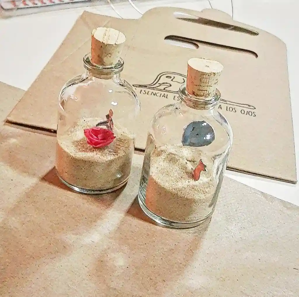 "en una caja viene dos frascos de vidrio uno tiene el principito y la flor el otro tiene el zorro y la luna dimensiones"