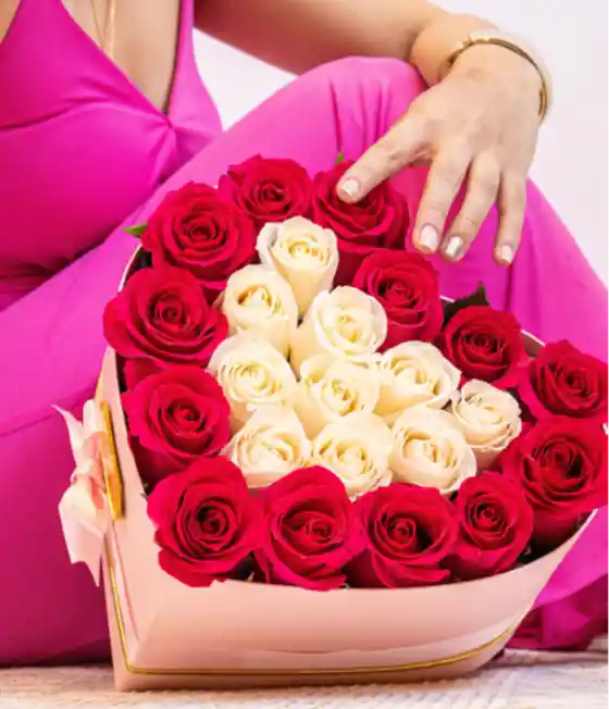 Arreglo floral con elegante presentación en tonos rosados, compuesto por rosas rojas y blancas cuidadosamente combinadas. Ideal para expresar amor y admiración en ocasiones especiales.