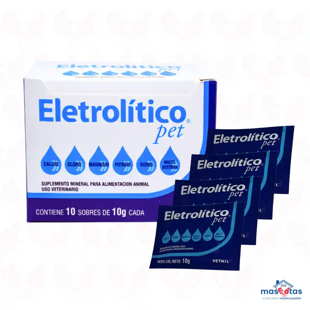 Si tu mascota necesita una rápida recuperación ten en casa Electrolítico, composición rehidratante perfectamente equilibrada para reposición oral de electrolitos perdidos. Eletrolítico Pet es una composición rehidratante perfectamente equilibrada para reposición oral rápida de electrolitos perdidos. Ingredientes: Calcio (Mín. y Máx.) 4.222 mg / 5.300 mg Cloro (Mín.) 318 g Magnesio (Mín.) 11 g Maltodextrina (Mín.) 150 g Potasio (Mín.) 59,6 g Sodio (Mín.) 171 g Para utilizarse vía oral. Caninos, felinos, mustélidos, aves, reptiles y roedores: diluir el contenido del sobre en 250 mL de agua y administrar, vía oral, a través de la jeringa. Para mantenimiento: el contenido del sobre podrá diluirse en 1L de agua. Dejar agua a disposición del animal durante el uso del Eletrolítico Pet.