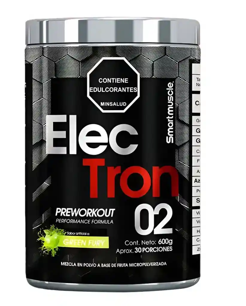 Electron Green Fury Smartmuscle es un pre-entrenamiento diseñado para aumentar la energía, concentración y rendimiento físico. Su mezcla de aminoácidos y estimulantes naturales mejora la resistencia y reduce la fatiga. Producto registrado por Invima.