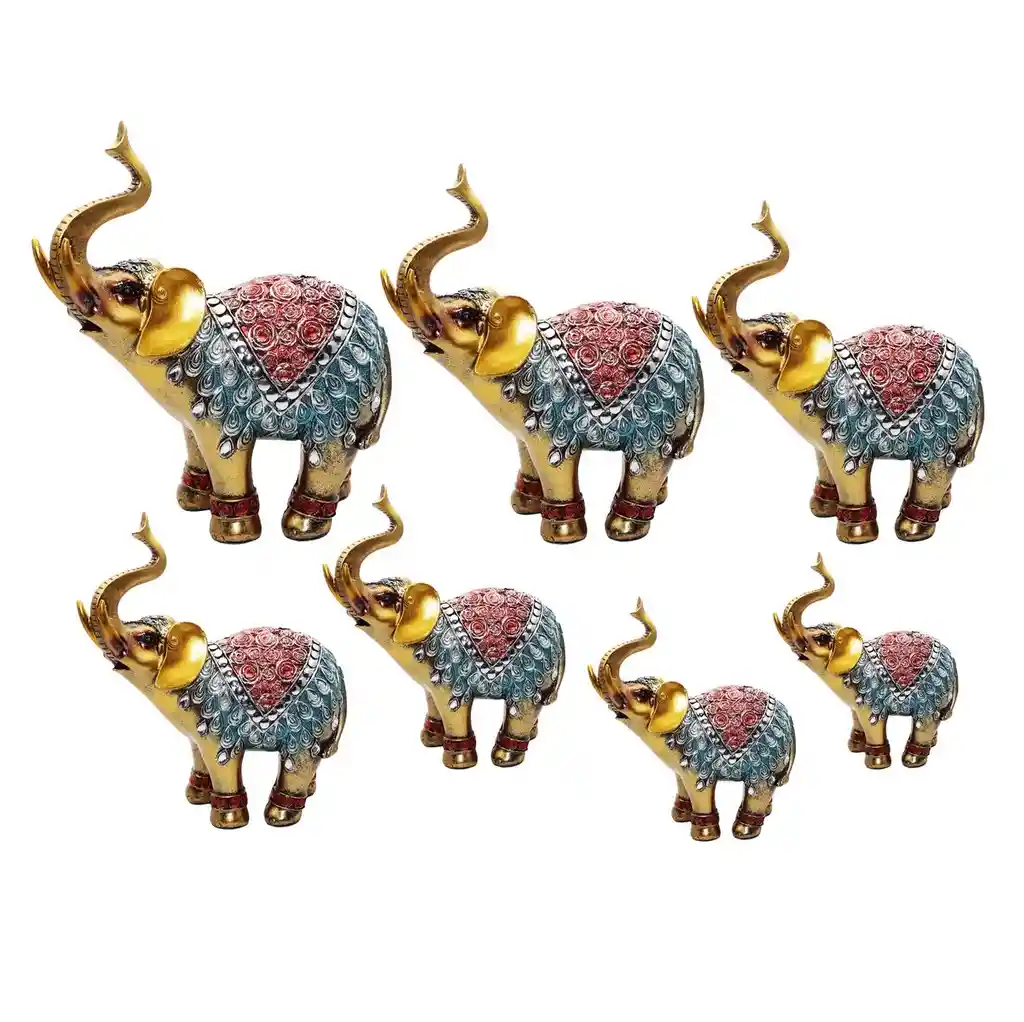 Hermoso set de elefantes siendo un símbolo de protección, la inteligencia y la buena suerte. El elefante tiene un gran significado espiritual en país asiático, donde es admirado por su longevidad, su inteligencia y su fuerza, y por estar íntimamente relacionado con el dios Ghanesa. Decora tu espacio favorito con este delicado artículo que traerá la sabiduría, armonía, serenidad a tú hogar. //// Nota: El precio corresponde a 7 elefantes como se aprecia en la fotografía y estos van variando de tamaño gradualmente. ///// Ficha Técnica: Dimensiones Figura Elefante Grande: (Ancho x Profundidad x Altura): 16cm x 8 cm x 20 cm Material de la figura: Poli resina Dimensiones Figura Elefante Pequeño: (Ancho x Profundidad x Altura): 7 cm x 3 cm x 7 cm Material de la figura: Poli resina ** _Para defectos de fábrica o retractos: \**_Por favor revise el producto apenas lo reciba y antes de usarlo. No aplican ley de retracto o defectos de fábrica luego de usar el producto. Se manejan máximo 5 días para reportar defectos de fábrica (por ejemplo, producto funciona mal, piezas faltantes, rotas, etc). Para hacer efectiva la devolución el producto debe devolverse con el empaque original, el cual debe estar en buen estado, incluir todos los documentos y las partes completas y sin daños. Los cuidados y recomendaciones para mantener un producto en buen estado son los siguientes: No aplicarle perfumes ni cremas directamente, no mojarlos, no dejarlos caer y procurar limpiarlos para retirar suciedad. Precauciones: No dejar nunca una vela encendida sin vigilancia, y mantener fuera del alcance de los niños.