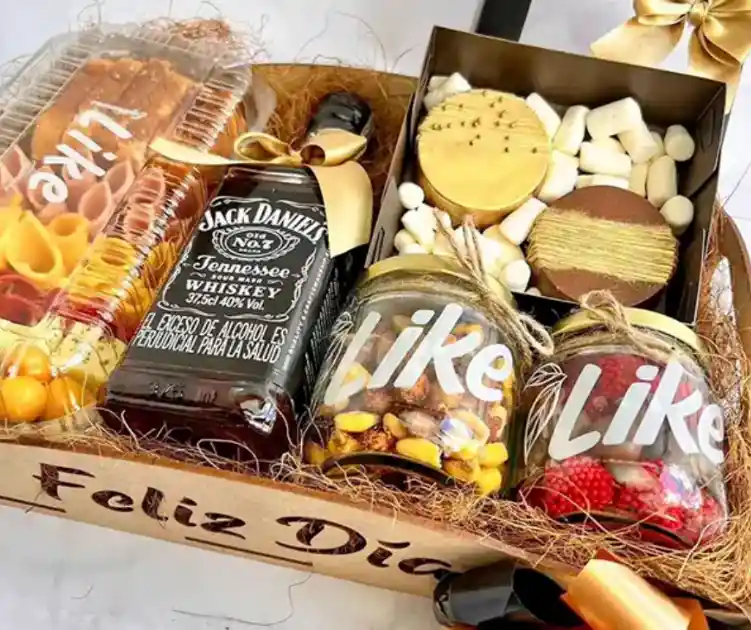 En el amor compartido, encontramos la dicha de brindar felicidad a aquellos que amamos. comparte este detalle y regala felicidad. Contenido: 1 Maridaje con diferentes tipos de Quesos, Salamis. madurados y tostados. 1 Botella de Whiskey Jack Daniel´s 375ml. 1 Caja con 2 Chocolates rellenos de Brownie y decoración con masmelos. 1 Frasco de Frutos Secos. 1 Frasco de Chocolates y dulces. Decoración Rustica tipo pesebre. Bandeja de Madera decorada con moño.