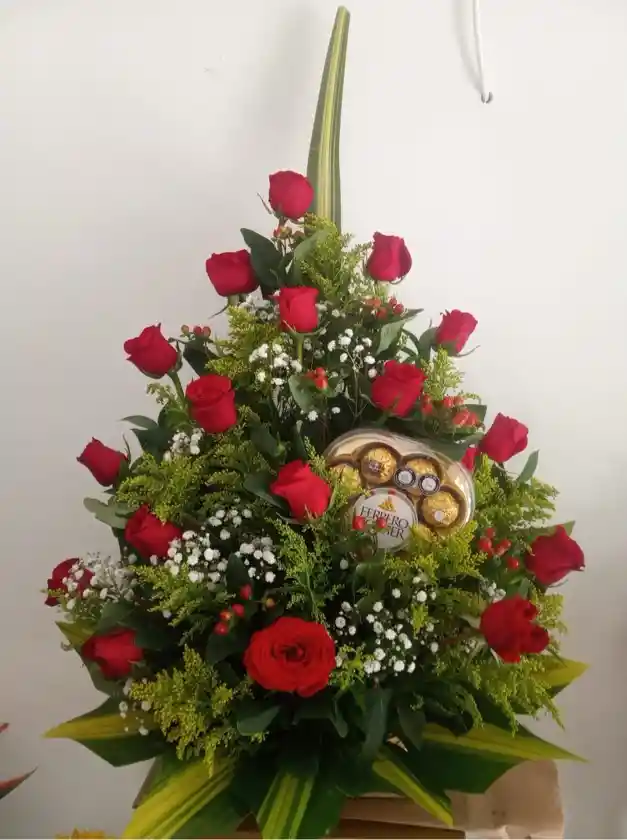 Un arreglo floral encantador, compuesto de rosas frescas y follaje, se presenta en una canasta elegante. Este conjunto incluye chocolates Ferrero, perfectos para complementar la belleza de las flores. Además, viene con una tarjeta personalizada, ideal para expresar tus sentimientos en ocasiones especiales. Una opción ideal para celebrar momentos significativos.
