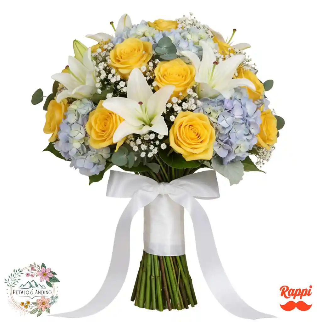 Ramo de novia elegante con rosas amarillas, lirios y hortensias.