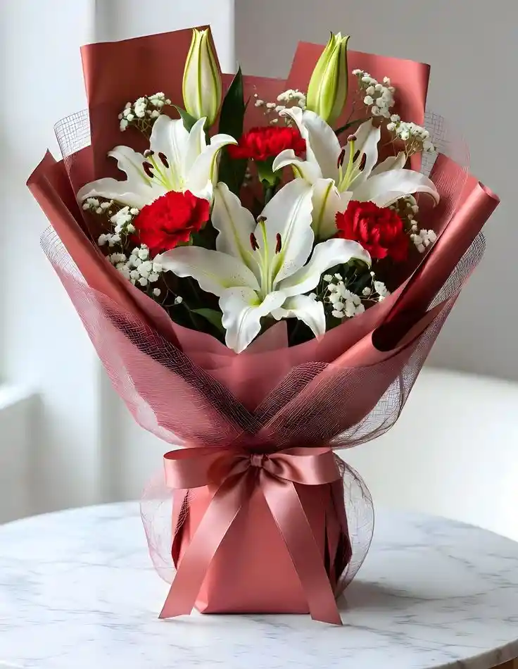Un diseño imponente que combina la pureza de los lirios blancos con la sofisticación de las rosas rojas . Rodeado de una delicada nube de gypsophila y envuelto en papel negro mate con bordes bronce.