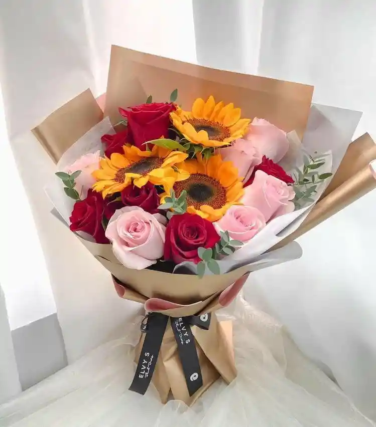 Elegante ramillete con girasoles y rosas, envuelto en fijo papel de color Multicolor ideal para el Felicitaciones