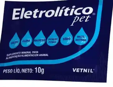 Eletrolítico® Pet Reponedor de electrólitos para pequeños animales DESCRIPCIÓN Eletrolítico® Pet es una composición rehidratante perfectamente equilibrada para la reposición oral rápida de electrólitos perdidos. INDICACIONES Suplementación de electrólitos indicada durante y después de los ejercicios físicos o para el mantenimiento de una adecuada hidratación en caninos, felinos, mustélidos, aves, reptiles y roedores. MODO DE USAR Para utilizarse vía oral. Caninos, felinos, mustélidos, aves, reptiles y roedores: diluir el contenido del sobre en 250mL de agua y administrar, vía oral, a través de la jeringa. Para mantenimiento: el contenido del sobre podrá diluirse en 1L de agua. Dejar agua a disposición del animal durante el uso del Eletrolítico® Pet. NIVELES DE GARANTÍA POR Kg DEL PRODUCTO: Calcio (Mín. y Máx.) 4.222 mg / 5.300 mg Cloro (Mín.) 318 g Magnesio (Mín.) 11 g Maltodextrina (Mín.) 150 g Potasio (Mín.) 59,6 g Sodio (Mín.) 171 g