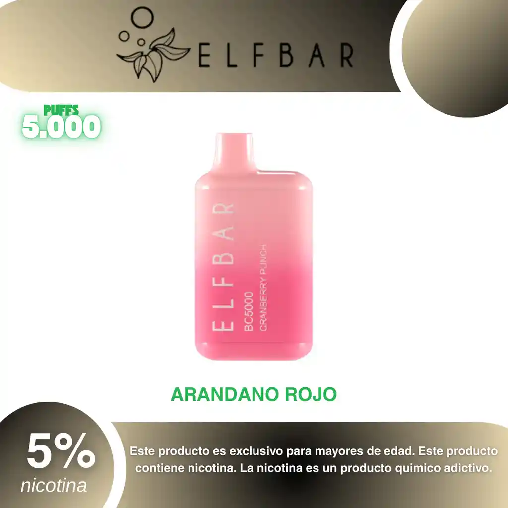 Elf Bar Bc 5.000 Puffs, Sabor Arandanos 5% PROHIBIDA LA VENTA A MENORES DE EDAD. ADVERTENCIA: ESTE PRODUCTO CONTIENE NICOTINA, LA NICOTINA ES UNA SUSTANCIA QUIMICA ADICTIVA Y NOCIVA PARA LA SALUD. Los líquidos para vapeo contienen: propilenglicol USP, glicerina USP, sabor artificial y nicotina. Este producto puede contener nicotina, una sustancia altamente adictiva que puede generar dependencia, posibles afectaciones arteriales, cardiacas, pulmonares y otras aun no identificadas. No se recomienda su uso a mujeres en embarazo, puede generar lesiones al feto. Mantener alejado de niños y mascotas. No ingerir, puede generar irritación y/o intoxicación. Por favor antes de consumir consulte a su médico posibles afectaciones o sensibilidad a alguno de sus componentes. Los componentes de este producto pueden aumentar la sensación de ansiedad En caso de notar alguna reacción adversa por favor suspenda su uso de manera inmediata. Siga las instrucciones en el envase. No alterar sus componentes. Adquiera sus productos en sitios de confianza No use productos piratas, alterados, o en los cuales no pueda comprobar su buena procedencia, Verifique la reputación del fabricante y distribuidor antes de adquirir cualquier producto Si no es usuario fumador o vapeador no se recomienda su uso bajo ninguna circunstancia Al usar este producto usted es consciente que este producto puede generar afectaciones a su salud, incluyendo aquellas que a la fecha de la compra no se han identificado y que pueden aparecer a largo plazo