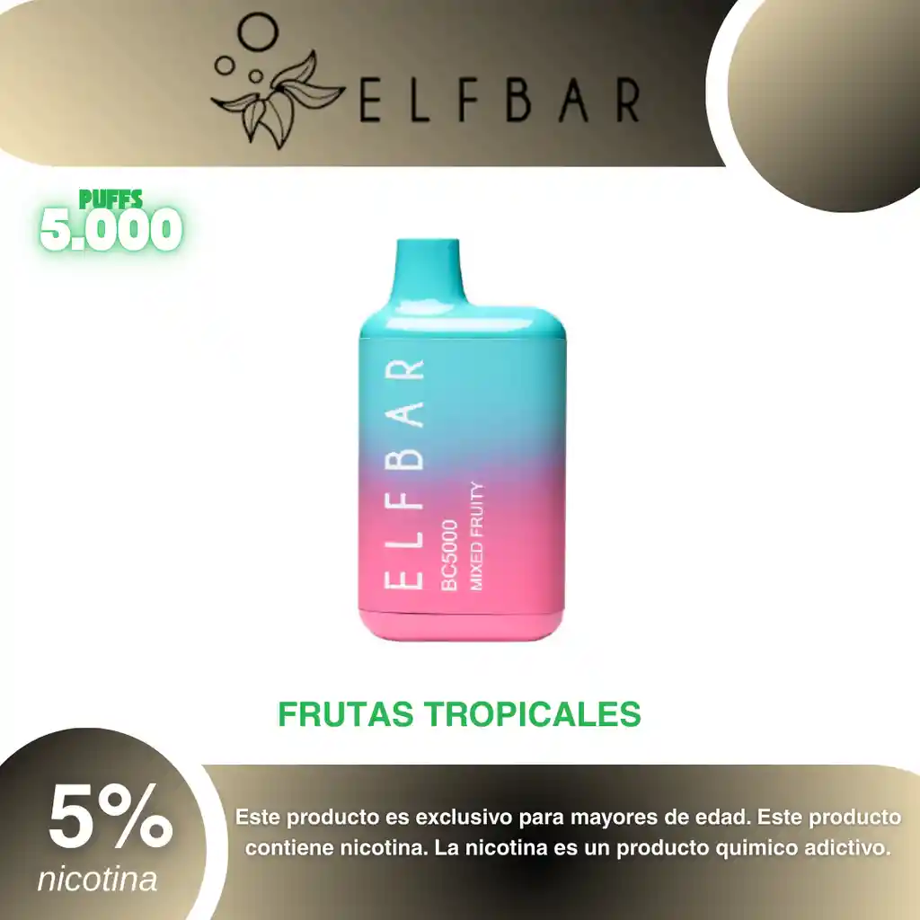 Elf Bar Bc 5.000 puffs, sabores frutas tropicales con un suave menthol. PROHIBIDA LA VENTA A MENORES DE EDAD. ADVERTENCIA: ESTE PRODUCTO CONTIENE NICOTINA, LA NICOTINA ES UNA SUSTANCIA QUIMICA ADICTIVA Y NOCIVA PARA LA SALUD. Los líquidos para vapeo contienen: propilenglicol USP, glicerina USP, sabor artificial y nicotina. Este producto puede contener nicotina, una sustancia altamente adictiva que puede generar dependencia, posibles afectaciones arteriales, cardiacas, pulmonares y otras aun no identificadas. No se recomienda su uso a mujeres en embarazo, puede generar lesiones al feto. Mantener alejado de niños y mascotas. No ingerir, puede generar irritación y/o intoxicación. Por favor antes de consumir consulte a su médico posibles afectaciones o sensibilidad a alguno de sus componentes. Los componentes de este producto pueden aumentar la sensación de ansiedad En caso de notar alguna reacción adversa por favor suspenda su uso de manera inmediata. Siga las instrucciones en el envase. No alterar sus componentes. Adquiera sus productos en sitios de confianza No use productos piratas, alterados, o en los cuales no pueda comprobar su buena procedencia, Verifique la reputación del fabricante y distribuidor antes de adquirir cualquier producto Si no es usuario fumador o vapeador no se recomienda su uso bajo ninguna circunstancia Al usar este producto usted es consciente que este producto puede generar afectaciones a su salud, incluyendo aquellas que a la fecha de la compra no se han identificado y que pueden aparecer a largo plazo.