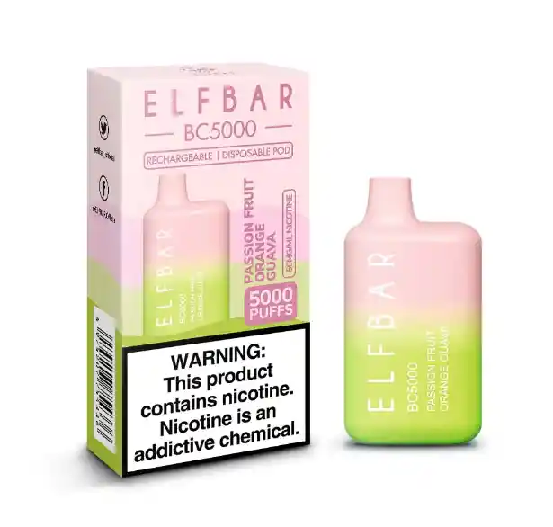 ELF BAR BC5000 PASSION FRUIT ORANGE GUAVA presenta una caja pequeña pero una gran potencia! El diseño del recipiente tipo jarra de este proporciona una experiencia de usuario cómoda. Una vez que lo tengas, ¡te encantará! Elf Bar 5000, que consta de una bobina doble, ofrece los sabores más puros. Elf Bar es recargable, lo que elimina el estrés de quedarse sin energía. ¡Los colores contrastantes de este dispositivo brindan diversión y personalidad Capacidad: 13 ml Batería de 650 mAh Carga con cable tipo-c (NO in cluido) Todos los sabores pueden contener trazas de menta y/o mentol.