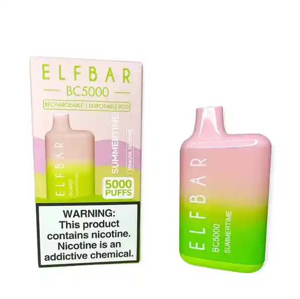 ELF BAR BC5000 SUMERTIME presenta una caja pequeña pero una gran potencia! El diseño del recipiente tipo jarra de este proporciona una experiencia de usuario cómoda. Una vez que lo tengas, ¡te encantará! Elf Bar 5000, que consta de una bobina doble, ofrece los sabores más puros. Elf Bar es recargable, lo que elimina el estrés de quedarse sin energía. ¡Los colores contrastantes de este dispositivo brindan diversión y personalidad Capacidad: 13 ml Batería de 650 mAh Carga con cable tipo-c (NO in cluido) Todos los sabores pueden contener trazas de menta y/o mentol.