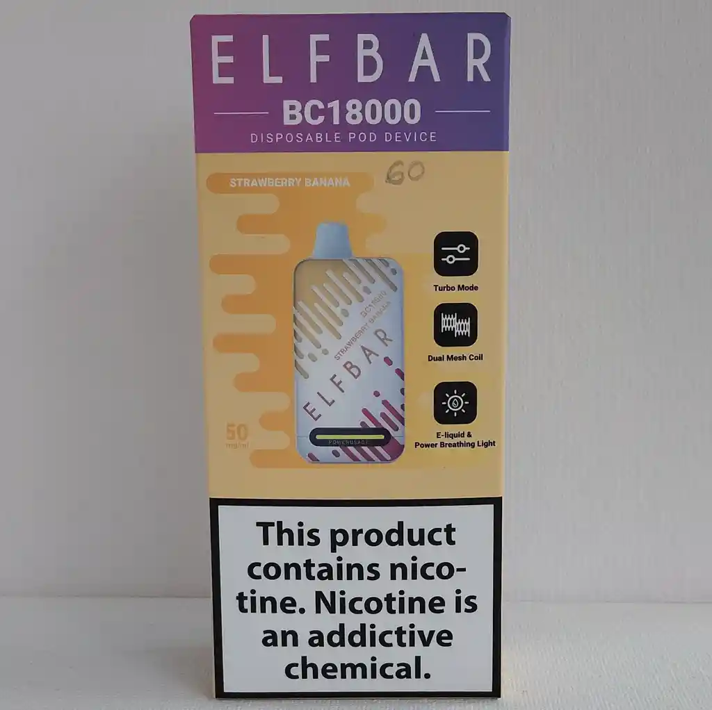 VAPEADOR ELFBAR 18.000 VAPEADAS (NORMAL) SABOR STRAWBERRY BANANA. ESTE PRODUCTO CONTIENE NICOTINA UNA SUSTANCIA ADICTIVA, PERJUDICIAL PARA LA SALUD , PROHIBIDA SU VENTA A MENORES DE EDAD