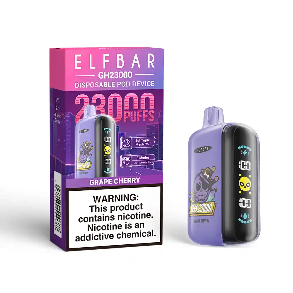 ELFBAR 23.000 PUFFS UVA CEREZA Este producto contiene nicotina una sustancia adictiva, es perjudicial para la salud. Prohibida su venta a menores de edad.