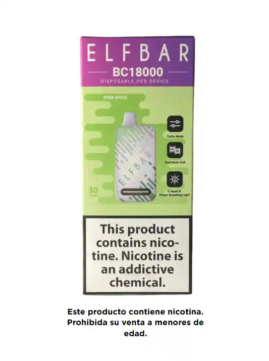 VAPEADOR ELFBAR BC 18.000 VAPEADAS SABOR SOUR APPLE, ESTE PRODUCTO CONTIENE NICOTINA UNA SUSTANCIA ADICTIVA, PERJUDICIAL PARA LA SALUD , PROHIBIDA SU VENTA A MENORES DE EDAD