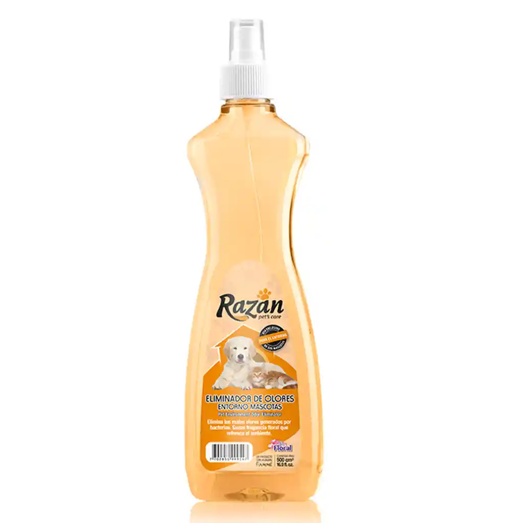 Eliminador de Olores Mascotas Razan 500 mL Posee una fragancia aromática para ser usada en los ambientes que frecuenta tu mascota, elimina hasta el 99.9% de bacterias y germenes que causan el mal olor dejando un fresco aroma.