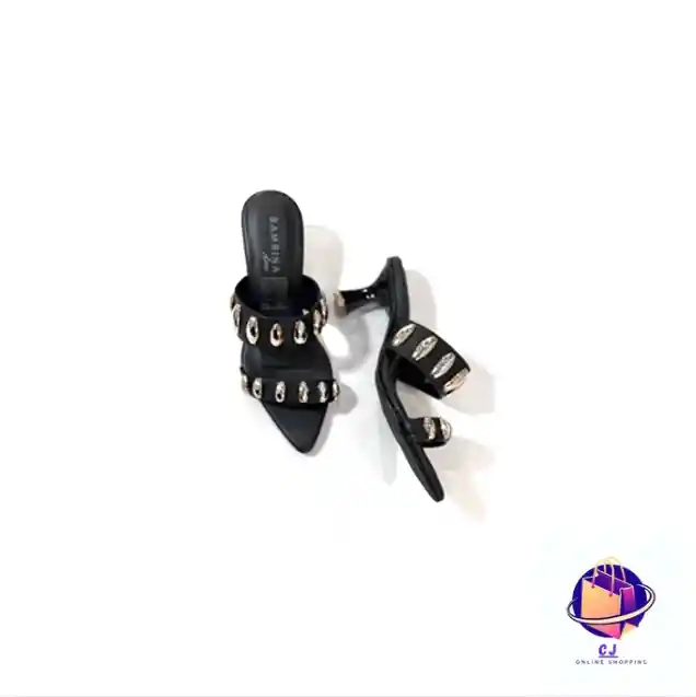 Sandalia negra con acabado brillante y decoraciones metálicas en las tiras. Diseño elegante con tacón firme que estiliza la figura y combina fácilmente con cualquier outfit. Talleje disponible 35-36-37-38-39-40