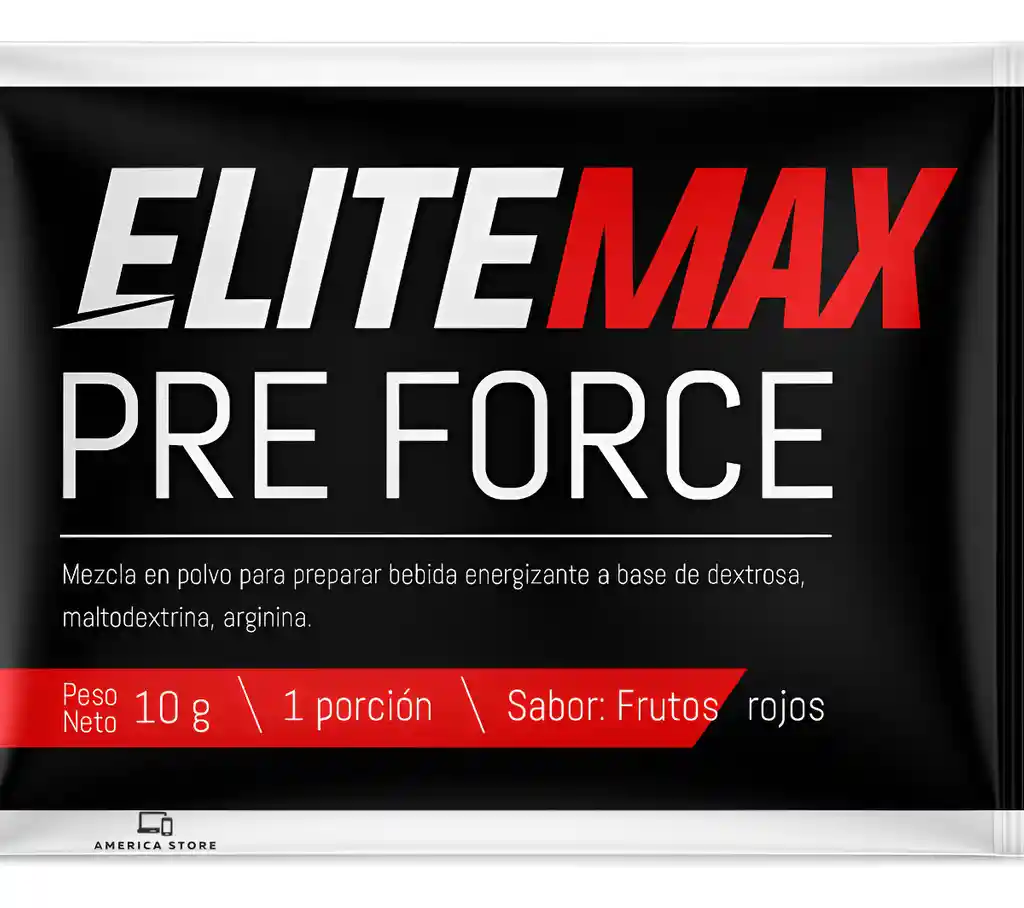 America Store te trae Elite Max Preforce Pre Entreno En Polvo Frutos Rojos X24 BENEFICIOS BETA ALANINA • Sustancia que aumenta los niveles de Carnosina, la cual aumenta la energía, el rendimiento y la resistencia. • Disminuye los efectos de la fatiga ya que tiene la capacidad de reducir la acumulación de ácido láctico en los músculos. MALATO DE CITRULINA • Neutraliza los efectos producidos por el ácido láctico. • Aumenta el rendimiento anaeróbico (ejercicios de resistencia). • Potencializa la acción de los BCAA. L-ARGININA • Activador del óxicdo nítrico. Actúa como un vasodilatador que ensancha los vasos sanguíneos para poder recibir una mayor cantidad de nutrientes hacia los músculos y potenciar así su crecimiento. • Mejora la absorción de las proteínas. CAFEÍNA • Estimula del sistema nervioso y mejora el estado de alerta. • Favorece el rendimiento durante la actividad física y disminuye la fatiga. • Aumenta el metabolismo de grasas y carbohidratos. OTROS • Aumenta la fuerza, energía, rsistencia y el rendimiento durante la actividad física. • Acelera el metabolismo, favoreciendo la pérdida de peso y acelera la recuperación post-entreno. • Proporciona carbohidratos de rápida absorción para potenciar la actividad muscular. INGREDIENTES Dextrosa, maltodextrina, L-Arginina, beta-alanina, citrulina, ácido cítrico, sabor a frutos rojos, taurina, cafeína. MODO DE USO • Disolver 10 g del producto (1 scoop incluido) en 300 ml de agua fría y mezclar muy bien hasta su completa disolución. • Tomar 15 o 20 min antes del entrenamiento. PRECAUCIONES • Producto recomendado y enfocado a personas deportistas de alto rendimiento y mayores de edad. • En ciertas personas la BETA ALANINA puede causar sensación de picazón en el cuerpo que no causa ningún tipo de peligro, sin embargo estas personas deben consumir solo la mitad del scoop mientras el cuerpo se acostumbra a la sustancia. • No se recomienda en consumo de bebidas energizantes con bebidas alcohólicas. • No recomendado para personas sensibles a la cafeína. • No apto para mujeres embarazadas, personas hipertensas, ni personas con enfermedades cardiacas. • No dirigido a personas anti coaguladas. • El límite máximo aceptable de consumo diario de este producto es de 1 porción al día.