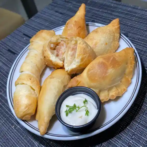 Empanada rellena de queso mozarella y jamón con masa suave y dorada.