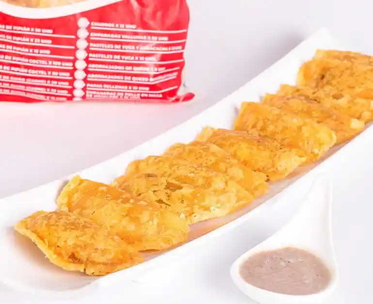 Deliciosas empanadas rellenas de queso doble crema con masa de harina de trigo por 10 unidades congeladas listas para hornear o freir.