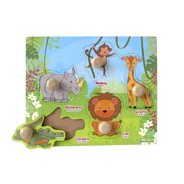 Contiene 5 Unidades. Nuestro Encajable se Compone Por 5 Fichas Con Diseño de Animales Salvajes en Madera Con Sus Respectivos Nombres en Español e Inglés, Estos en la Parte Superior Cuentan Con un Botón Para Una Mejor Manipulación de Sus Piezas al Momento de Encajar en la Tabla Base, También Ayudan a Identificar Formas, Desarrollar su Motricidad Fina y Conocer Animales. Las Medidas Del Producto Son: 24 x 29 x 3 cm.