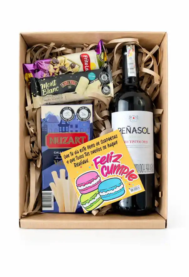 Caja Encanto Box incluye: 1 botella de vino tinto Peñasol (750 ml), 1 caja Nuzart Barquillos 145g, 1 chocolatina Mont Blanc Baileys (42 g), 1 maní con pasas (50 g). Caja, moño y tarjeta con mensaje. La caja se envía en una bolsa sellada con sticker alusivo a la celebración. Tarjetas disponibles: Cumpleaños, amor, feliz día, feliz día, mujer, feliz día, hombre, mamá, papá San Valentín