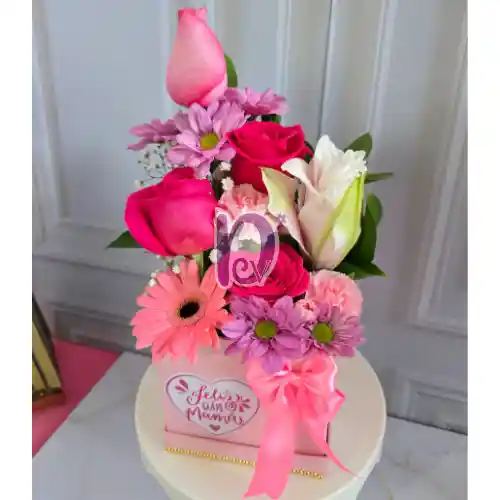 Caja cuadrada con flores ubicadas en forma de escala, tonos pasteles y hermosos.