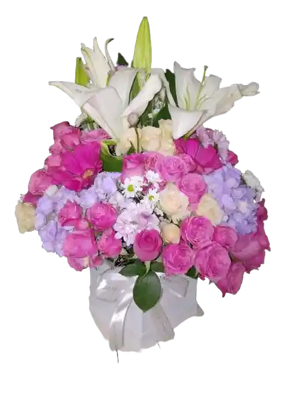 HERMOSA CAJA EN CUBO CON UN MIX DE ROSAS Y HORTENCIAS DE COLORES PASTELY LIRIOS DEL JAPON