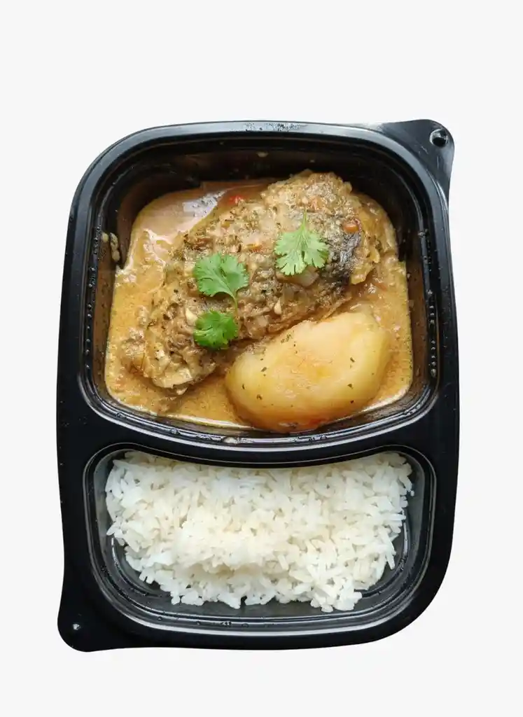 Comida congelada, lista para calentar. Ingredientes: Pescado, papa pastusa, tomate, cebolla larga, cebolla cabezona morada, Leche de coco, pimentón, Cilantro, ajo, sal, caldo de gallina desmenuzado, paprika, orégano, (arroz, aceite vegetal).