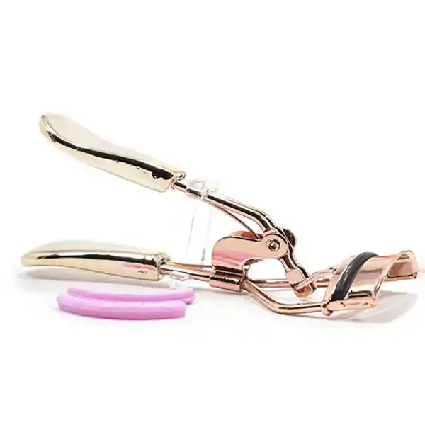 Encrespador de pestañas diseño metálico con bandas de goma internas. Viene con un repuesto de silicona.